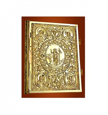 Evanghelia se afla pe Sfanta Masa si simbolizeaza pe Insusi Mantuitorul care a luminat Lumea cu invatatura Sa. Cuprinde cele 4 evanghelii: Matei, Marcu, Luca si Ioan este imbracata in chip deosebit, in coperti argintate sau aurite, impodobita cu emailuri, avand in centru icoana Invierii, in colturi icoanele evanghelistilor iar pe spate icoana Rastignirii. In cadrul obiectelor religioase, Sfanta Evanghelie ocupa un loc extrem de important. Evanghelie aurita, text in lb. romana inclus , dimensiuni: 26 cm x 36 cm..
